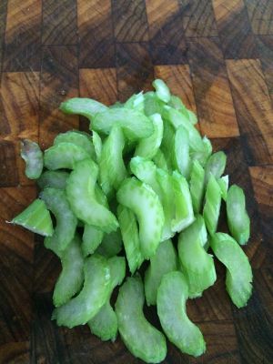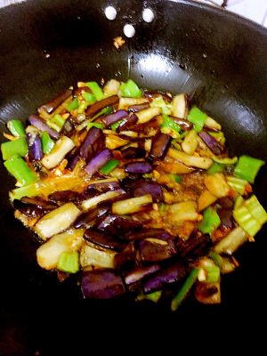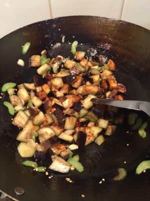 油热之后先放芹菜和大蒜 爆出香味之后放茄子
