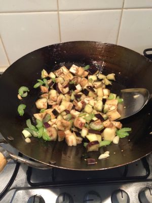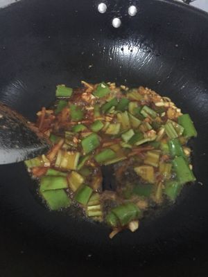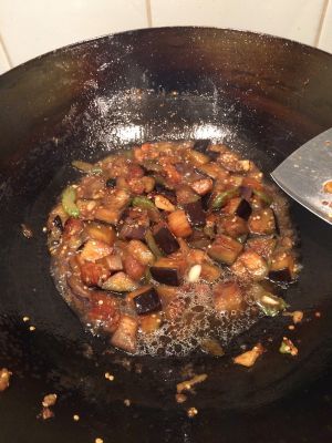 把蒜、生姜放锅里炒、加入番茄酱、辣椒、炒一会。然后加入之前炸好的茄子、大火炒一会、