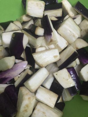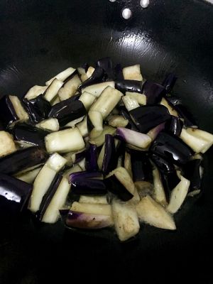 将茄子切段,然后放入热油中炸一下,不要太久,,变金色即可