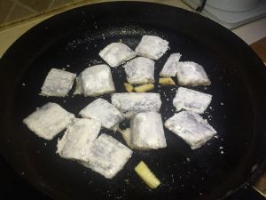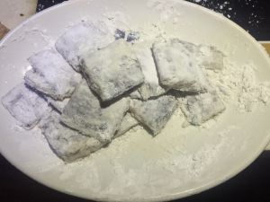 浸泡好的带鱼段,放入生粉中裹粉,两面均匀!