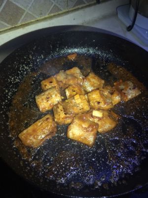 烹入料酒,加生抽、老抽、蚝油、香醋(先放一半)盖上锅盖大火收汁,汁水差不多,剩下香醋沿着锅边倒下,汁水多少根据个人喜好而定!