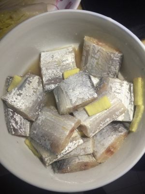 带鱼沥干水,放少许黄酒,盐,姜片腌制半个钟头以上。