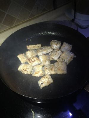 倒掉腌制出来的汁水,裹一层淀粉,锅里放油,油热下锅煎