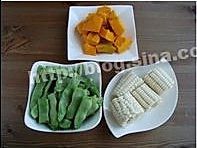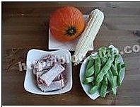 南瓜去皮切块,豆角去筋掰成小段,玉米切段备用;