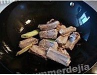 锅中油热后,放葱、姜、花椒、八角煸香,放入排骨煸炒至出油;