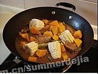 放入玉米、南瓜大火煮开,小火煮十五分钟即可。