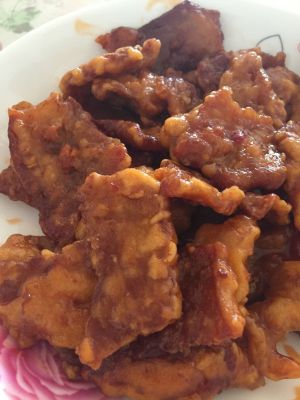 把炸好的肉片放一边 把调好的料汁放入锅中 把汤汁熬到黏糊状 在倒入肉片 。等汤汁全部包裹好肉片即可