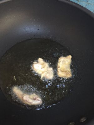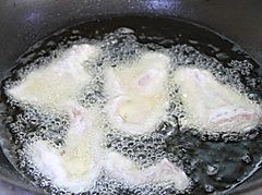 锅中烧热油,将肉一片片挂糊后,放入炸至金黄色;
