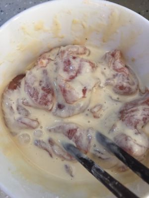 猪里脊切道北厚、巴掌大的片,准备挂浆;最好用新鲜猪肉,否则冷冻肉太水了,炸的时候容易水!