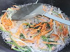 炒锅中放底油,将胡萝卜丝、香菜、香葱、姜片放入翻炒;
