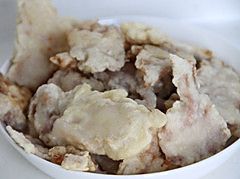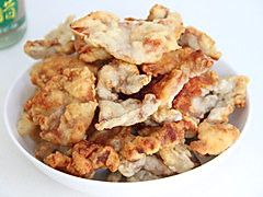 1、外脊肉切适当大小肉片,调水粉糊(水加淀粉)调制粘稠状。肉片裹糊,油温五、成热,刚冒白烟..。炸至定型捞出,然后再炸至熟透。