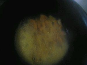 锅中热油,油开后转小火放入地瓜炸至表面有点焦黄捞出。