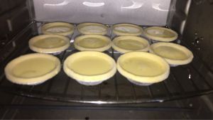 观察蛋挞表面的颜色,出现大块黑斑就烤好了。
