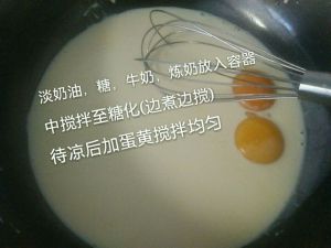 淡奶油,糖,牛奶,炼乳放入容器中边煮边搅至糖化。待凉后放蛋黄拌匀加过筛后的粉拌匀