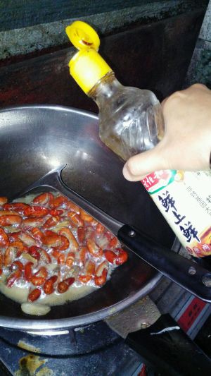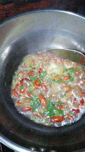 锅中放入油八成热后加入八角、三奈、花椒,然后放入豆瓣酱煸炒,(我家比较喜欢吃辣,我还加入了泡椒,小米辣)再依次加入姜末,蒜头,炒香后放入小龙虾,水分煸干后加入料酒翻炒后,加水(以淹过小龙虾为宜),大约煮20分钟左右收汁加入葱段,装盘即可!