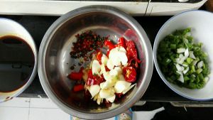 捞起炸好的小龙虾,锅内留油,倒入蒜瓣、姜片、干辣椒爆香。