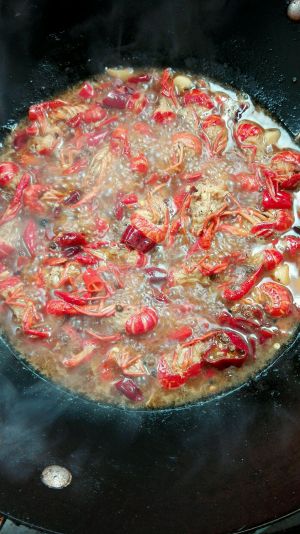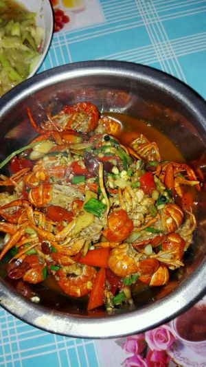 再加入老抽,生抽,蚝油,糖,醋,白酒,五香粉,水淀粉,少量水焖煮。直到水收干。放入葱花,盐,可以起锅啦!一定要多煮,因为龙虾里有寄生虫!