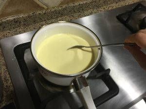 首先,牛奶奶油糖,放进一个盆里,隔水加热,由于水有浮力,所以不用担心会糊锅