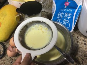 然后,等白糖完全溶解,加入打散了的蛋黄和吉士粉,过滤