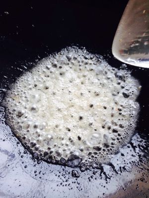 锅里的油倒干净放五大匀白糖加一点点水开小火融化白糖,然后一直搅拌,搅拌到白糖冒泡