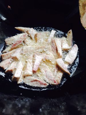 油温稍微起来了,不用太烫,就可以下芋头了。炸芋头过程中持续保持大火,炸到边边有点点焦的迹象就行了。