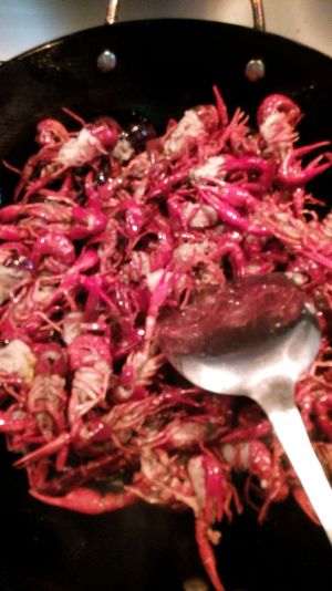 锅烧热后放入油(开大火)烧热(越热越好),然后放入腌制后的小龙虾,翻炒油爆,虾变红之后捞出小龙虾(整个过程必须大火)。