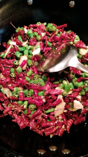 油爆小龙虾后的油烧热,放入青花椒,姜片,蒜片炒至有香味,再放入洗净的干海椒段,青椒段,少许香料(转小火)炒至辣味出来。