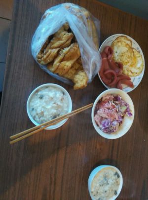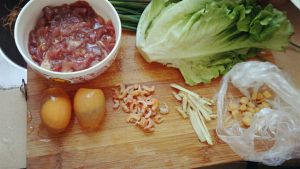 瘦肉切丝,用热水焯一遍,和姜丝食盐放一起腌制(酌情添加酱油或者香油)