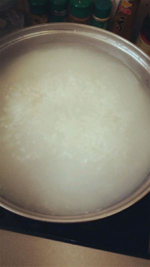 锅里放米(差不多蒸米饭的量杯半杯)、适量水、倒入香油、一片姜、盐、胡椒粉,大火烧开(可以烧开后关火闷半小时在煮十分钟就熟了)。
