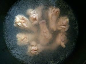 把鸡腿解冻,在鸡腿两面划伤两刀,用凉水把鸡腿煮一下,十分钟左右。