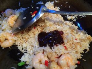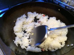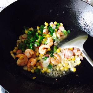 饭小火下锅 因为我是用笼屉蒸的 所以饭都是很散的 不用很多油 打散后加虾仁