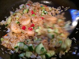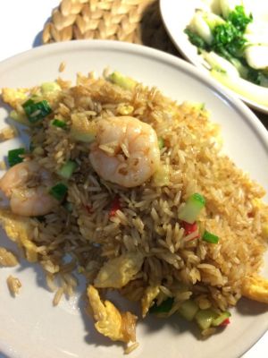 油锅先放洋葱和虾炒出香味,马上放玉米、蟹柳,炒10来下放入饭和青椒,继续炒,放盐、鸡精炒均匀、放料酒 就可以起锅了。