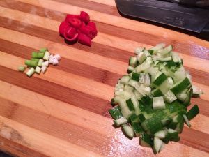 加黄瓜 剩下的红椒还有葱 大火快速翻炒后加盐鸡粉 炒匀快速出锅