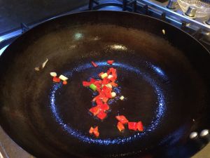 大火爆香 留一些红椒和葱 最后再下 提下味