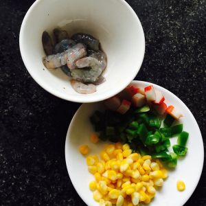 虾仁、蟹柳、玉米、青椒、洋葱,洗净 切好,备用