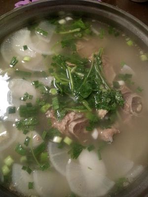 出锅,加入蒜苗,香菜,适量胡椒粉。可以开吃了。