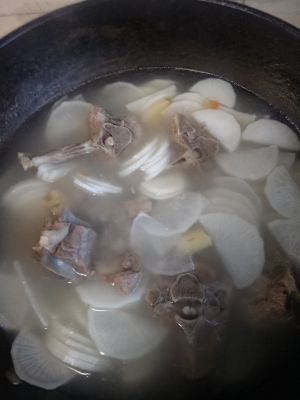去除生姜,葱,蒜等调料,加入盐,鸡精等调味,加入萝卜,大火继续炖五分钟。