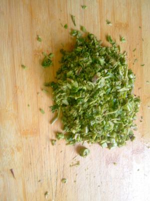 先把香椿焯一下,切粒。