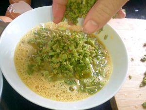 香椿切碎,鸭蛋加盐、料酒打散