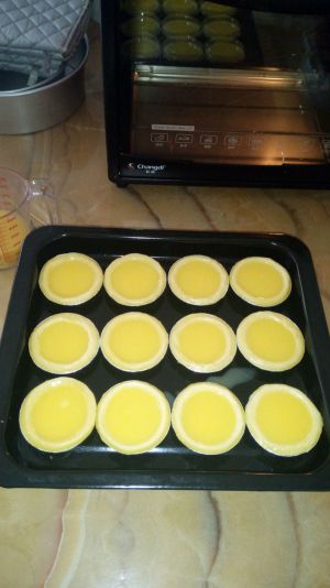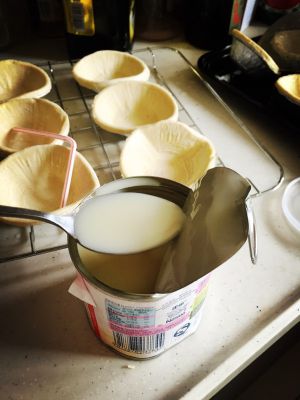把挞水倒进蛋挞皮里,倒9分满,不用担心会太满,烤的时候挞水是不会溢出来的,9分满刚刚好