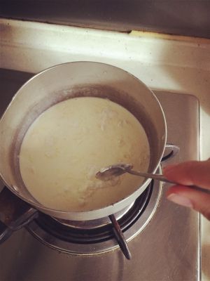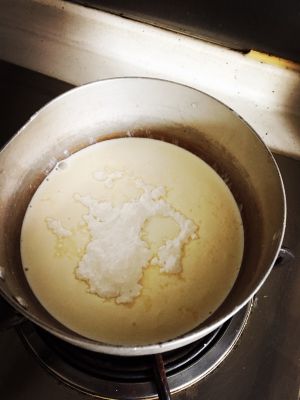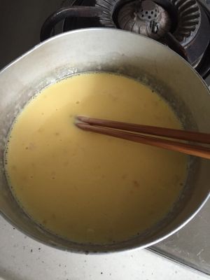 等糖水放至微凉了,就把吉士粉倒进糖水里,搅拌均匀,吉士粉遇水就变黄色很好看的,所以做蛋挞水最好选用吉士粉,不过没有也可以用低筋面粉代替