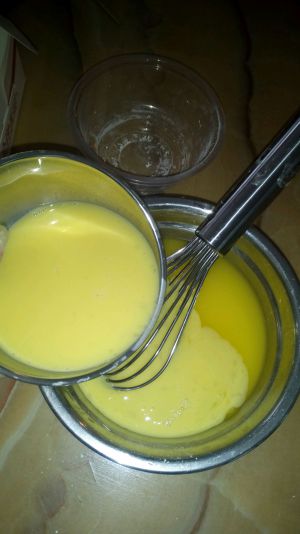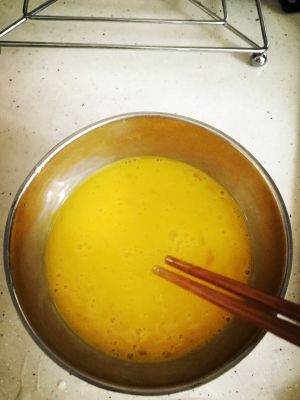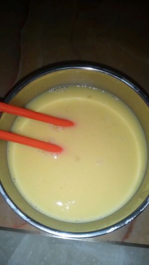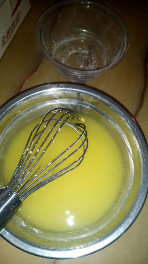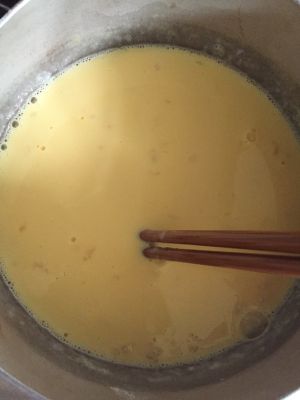 把鸡蛋液倒进刚刚放了吉士粉的糖水里,继续搅拌均匀