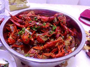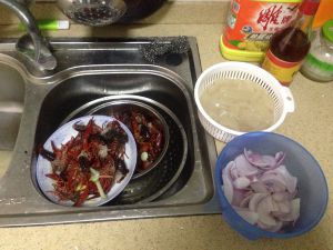 小龙虾俺们一个一个的刷洗的,脑袋是去掉了的,虾肠也抽了的,用盐泡了洗净,直到水清亮,洗虾过程中不能用力,避免虾子钳子断掉,我戴了手套从下往上轻轻洗的!小龙虾洗净沥干用料酒,盐,葱姜蒜腌制!