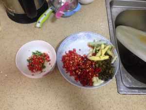 泡姜、泡蒜和泡椒各适量,全部切碎后,混在一起剁细。五花肉适量,切成均匀的肉丁(猪皮不要)备用。将油烧成高温油后,下入小龙虾,炸至小龙虾变红后,倒出备用。