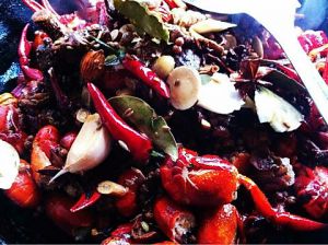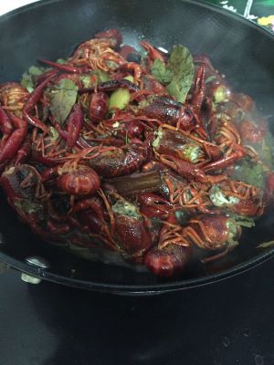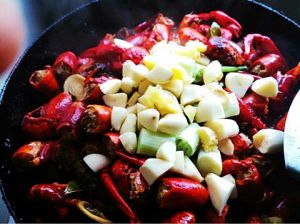 葱姜干椒入锅,火锅底料,香料下锅炒香,下龙虾炒制,加水没过龙虾即可