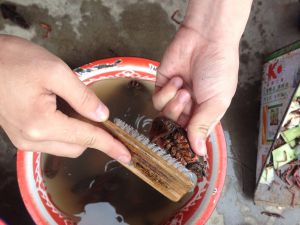 剪去脚脚和小的钳子,大的钳子要留下,有肉的。然后用刷子刷干净