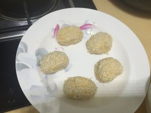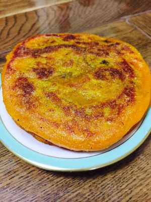 取等量南瓜面团和豆沙球,面团压成圆饼,中间略厚,四周略薄,包豆沙球,压扁,慢火双面煎。