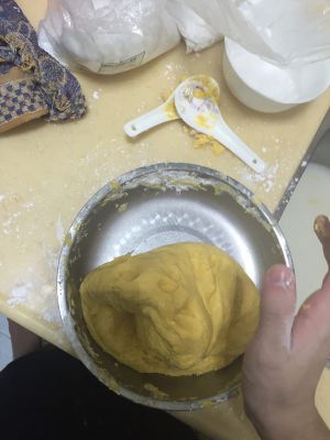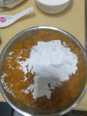 糯米粉和南瓜以及白糖混在一起,揉成面团