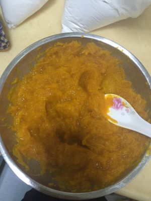 买来的南瓜切皮去核,上锅蒸熟用勺子弄软