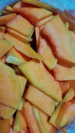 食材都准备好。花生炒熟备用,南瓜去皮切片蒸熟。
